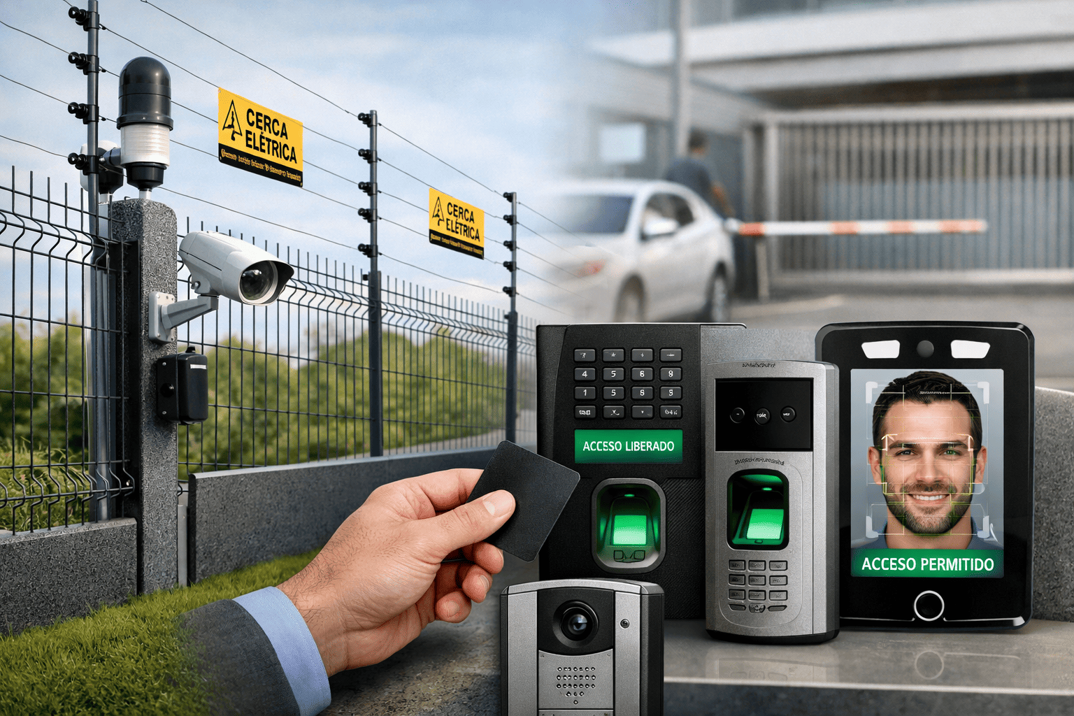 Proteção perimetral com cerca elétrica e sensores, prevenindo invasões. Soluções para gerenciamento de entrada e saída de pessoas em residências, condomínios e empresas.
